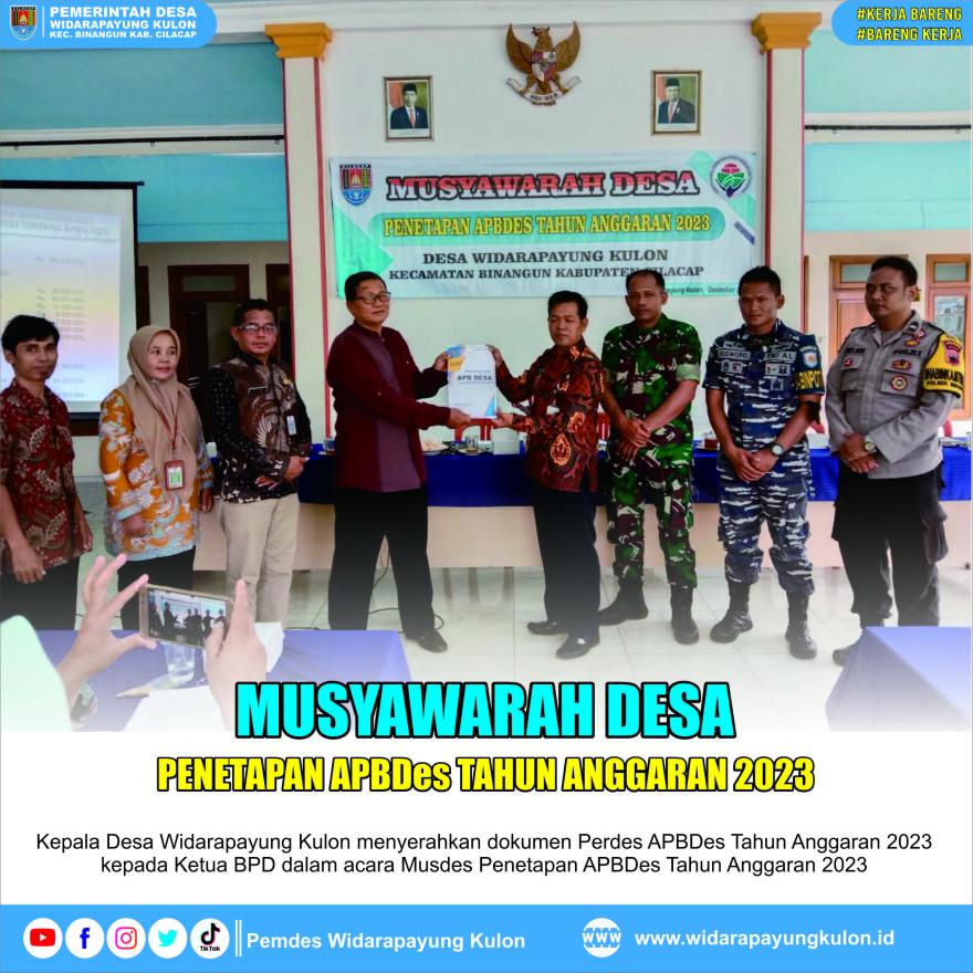 Pada hari Jum'at, 30 Desember 2022 Pemerintah Desa Widarapayung Kulon bersama Badan Permusyawaratan Desa (BPD) dan peserta musyawarah dari keterwakilan lembaga dan kelompok (RT/RW, PKK, LPMD, KPMD, Karang Taruna, BUMDes, Linmas dan Tomas/Toga) melaksanakan kegiatan Musyawarah Desa Penetapan APBDes Tahun Anggaran 2023.