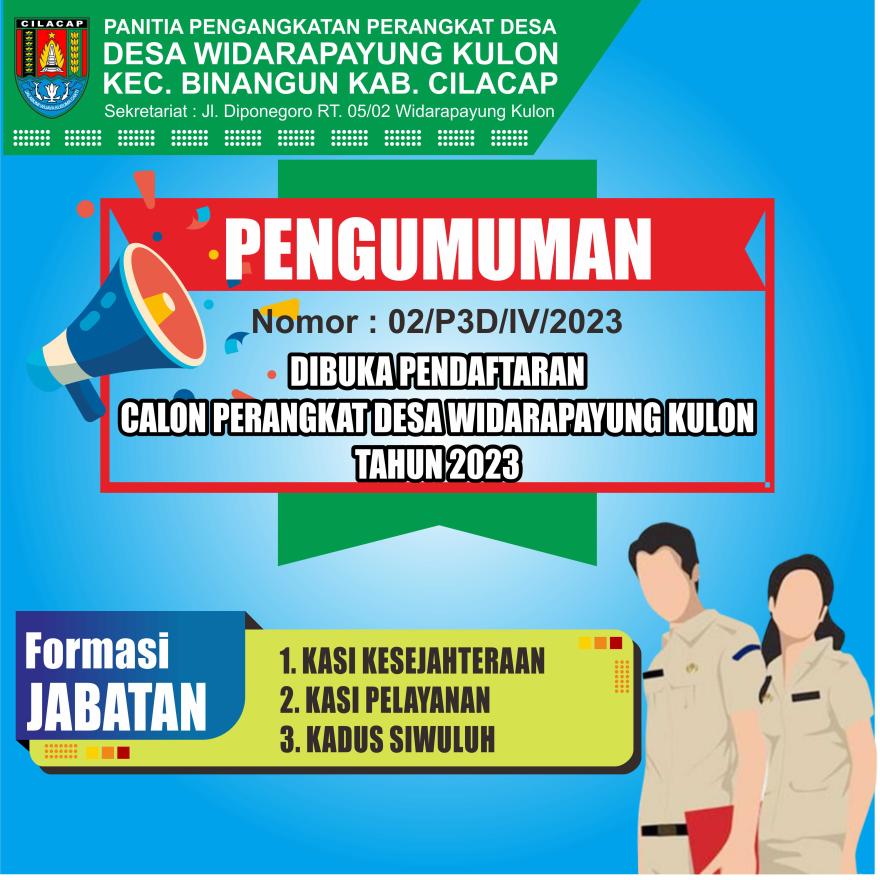 Menindaklanjuti Keputusan Panitia Pengangkatan Perangkat Desa Widarapayung Kulon Nomor 01 Tahun 2023 tentang Program Kerja Panitia, dengan ini mengumumkan Pelaksanaan Pendaftaran Calon Perangkat Desa Widarapayung Kulon Kecamatan Binangun Kabupaten Cilacap sebagai berikut :